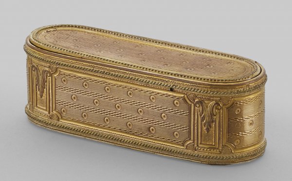 Tabatiere Kupfer, vergoldet. Länglicher Korpus mit gerundeten Enden. Flächendeckend fein guillochiert und ziseliert. An der Wandung mit blattförmigen Voluten verziert und durch schmale Ornament- und Kordelbänder gegliedert. Scharnierdeckel zum Drücken nach Innen. Altersgemäße Gebrauchsspuren. Undeutl. gest.; H. 3 cm. 9,3 cm x 3,2 cm.