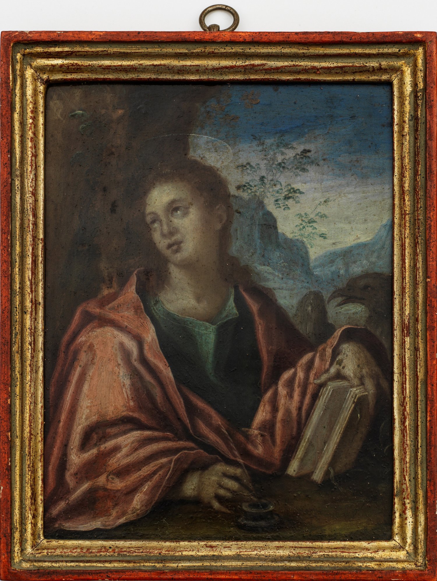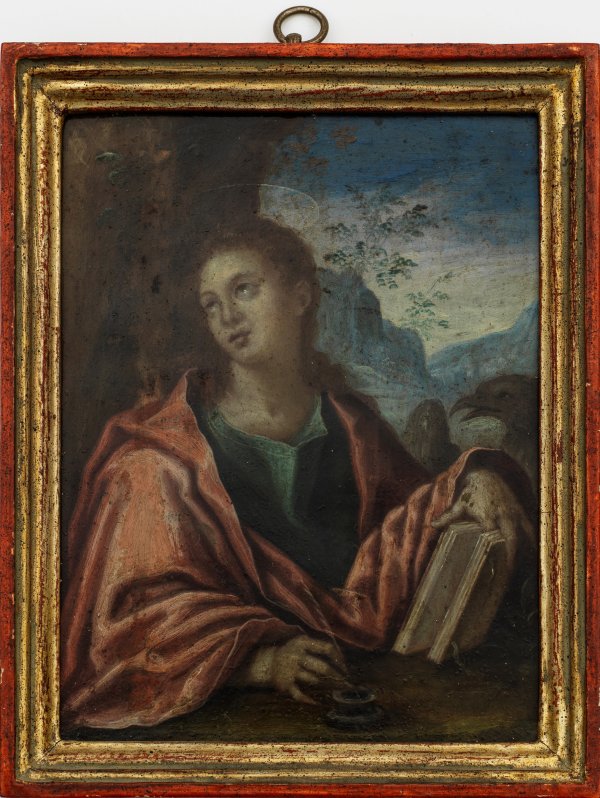 Vor einer Gebirgslandschaft fein gemalte Darstellung des Heiligen Johannes, der einen Federkiel in ein Tintenfass taucht und mit einem Finger eine Buchseite offen hält, dicht daneben der Adler als weiteres Attribut des Verfassers des hl. Evangeliums. Hervorragend im Stil des Manierismus bemalte, dünne Kupfertafel. Öl/Kupfer; 18 cm x 14 cm. Rahmen.