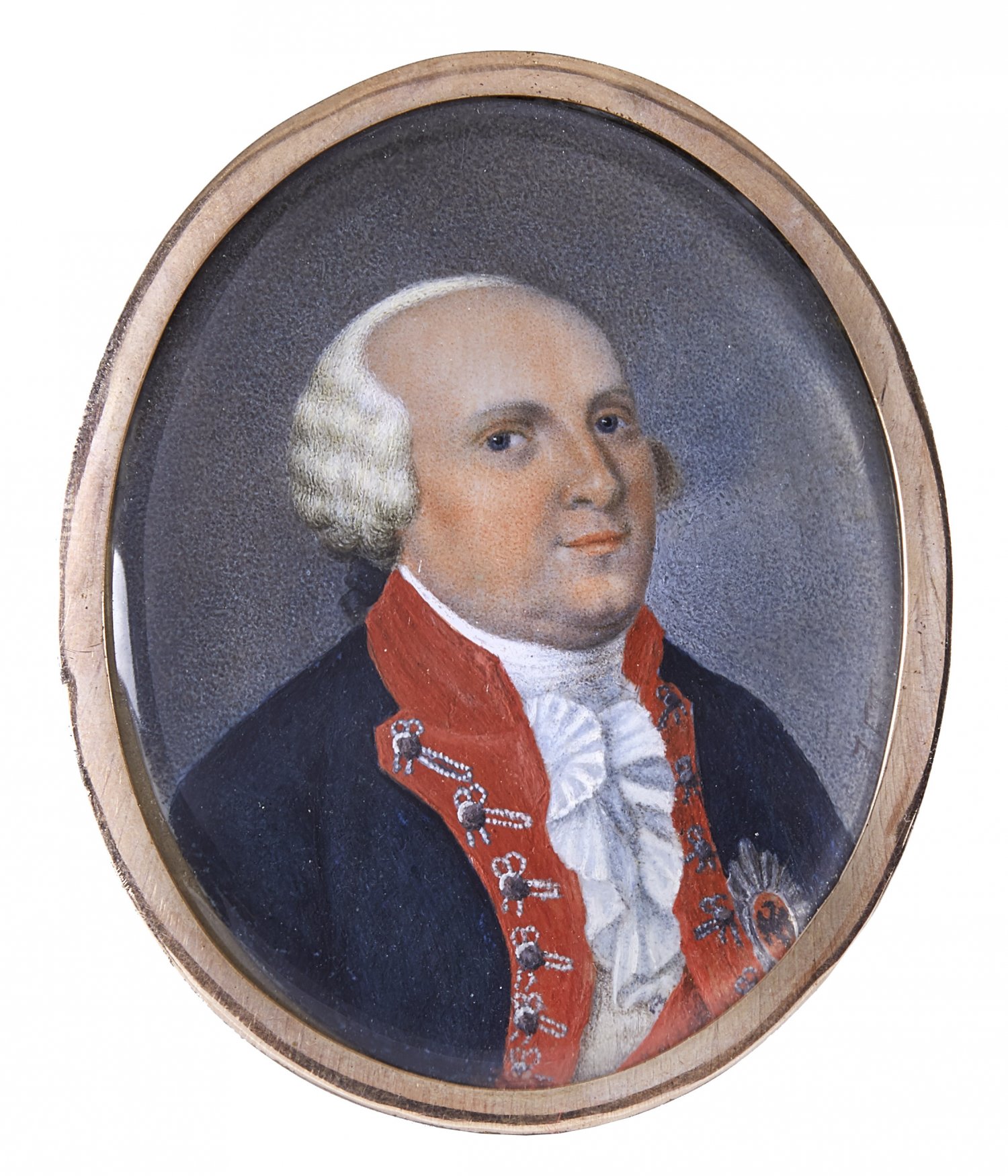 Friedrich Wilhelm II. (Preußen) von Johann Friedrich Taubert Brustbildnis des 1786 zum preußischen König und Kurfürst von Brandenburg ernannten Thronfolgers Friedrich des Großen, in Uniform mit Bruststern vom Orden des Schwarzen Adlers. R. monogr. "J.F.T.". Feine Temperamalerei auf Elfenbein. Schmaler Kupferrahmen. 7,5 cm x 6 cm.
