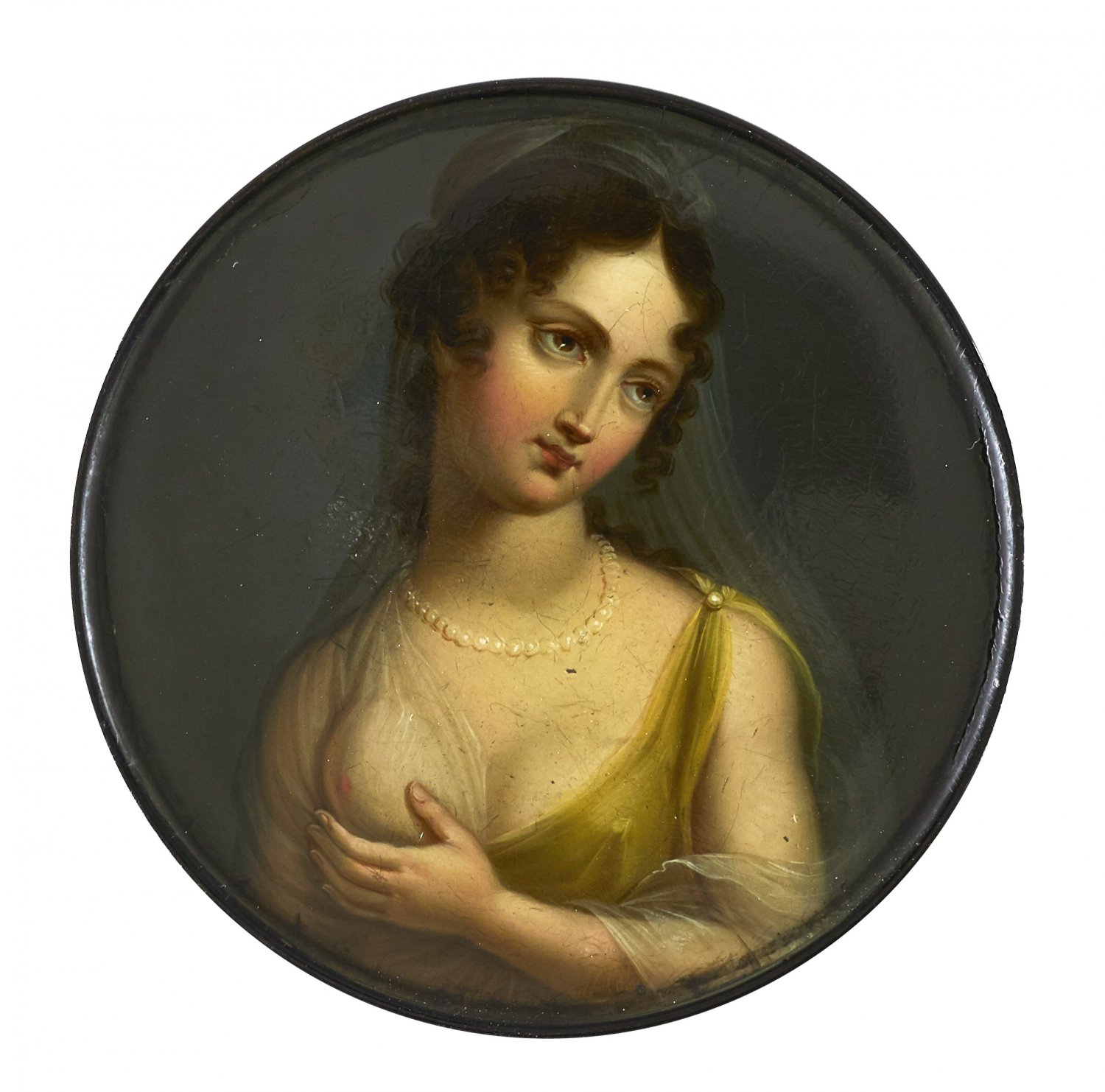 Schnupftabakdose Pappmaché, schwarz lackiert. Rund, mit eingezogener Wandung. Auf dem Deckel Darstellung einer jungen Dame in antikisierendem, zart lindgrünem, hell durchsichtigem Kleid und großer Perlenkette um den Hals, die linke Hand unter ihre Brust haltend. Über den dunkelbraunen gelockten, hochgesteckten Haaren ein durchsichtiger Schleier. Im Innendeckel in Hellrot betitelt "L' invitation". Im Innenboden Herstellermonogramm und nummeriert 1569 in Rot. Polychrome Lackmalerei. Minim. best.; H. 2 cm. D. 9,4 cm.