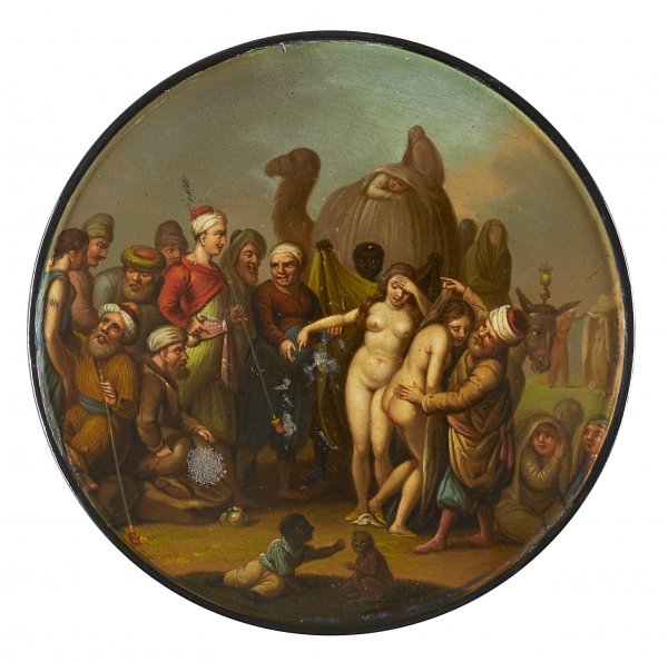 Schnupftabakdose Pappmaché, schwarz lackiert. Rund, mit eingezogener Wandung. Auf dem Deckel detailreiche Darstellung eines orientalischen Sklavinnenmarktes. Nach der Vorlage "Tschercassische Ware (Der Sklavinnenmarkt)" von Johann Heinrich Ramberg (1763-1840). Im Deckel in Rot betitelt. Im Innenboden nummeriert "14059" und Manufaktursign. in Rot. Polychrome Lackmalerei. Minim. altersbedingte Gebrauchsspuren. H. 1,8 cm. D. 9,5 cm.