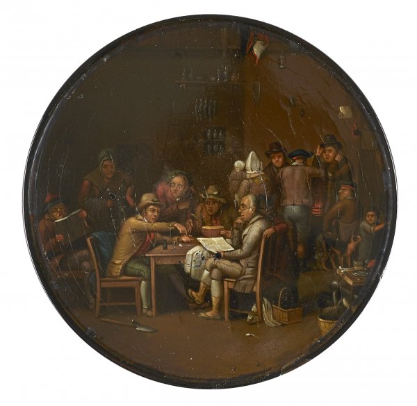 Schnupftabakdose Pappmaché, schwarz lackiert. Rund, mit eingezogener Wandung. Auf dem Deckel detailreiche Darstellung einer angeregt disputierenden Männergesellschaft, im Hintergrund eine weitere diskutierende Personengruppe am Kamin. Nach dem Gemälde "The Village Politicians" von David Wilkie (1785-1841). Polychrome Lackmalerei. Im Deckel rot betitelt mit "Les politiques du village" und bez.; Zweifach nummeriert. Im Innenboden Manufaktursignatur in Rot. Polychrome Lackmalerei. Unw. besch. und rest.; H. 1,7 cm. D. 9,5 cm.
