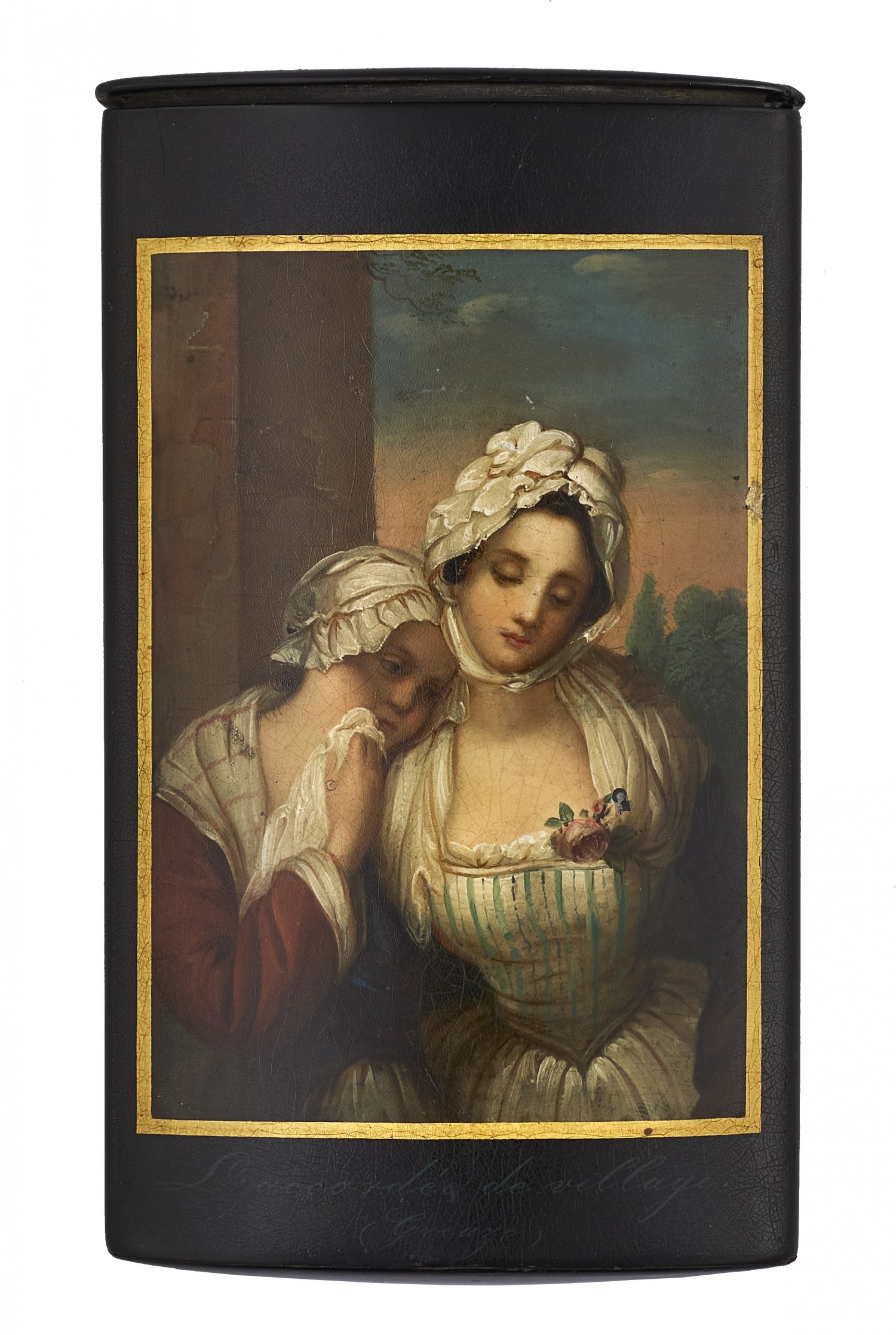 Zigarrenetui Pappmaché, schwarz lackiert. Hochrechteckig mit ovaler Bodenfläche, gerundeten Seiten und flachem Scharnierdeckel. Schauseitig eine goldgerahmte Darstellung von zwei aneinandergeschmiegten Mädchen in bäuerlichen Kleidern mit Rüschenhauben. Unterhalb betitelt "L Accordée de Village". Ein Auszug aus dem gleichnamigen Gemälde von Jean Baptiste Greuze (1725-1805). Im Innendeckel Herstellermarke in Rot. Minim. altersbedingte Gebrauchsspuren. H. 13 cm. B. 7,5 cm.