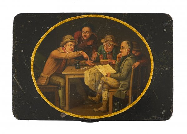 Schnupftabakdose Weißblech, schwarz lackiert. Auf dem Scharnierdeckel detailreicher Bildausschnitt einer an einem Tisch sitzenden und angeregt disputierenden Männergesellschaft. Nach dem Gemälde "The Village Politicians" von David Wilkie (1785-1841). Polychrome Lackmalerei. Im Deckel rot betitelt und in grau nummeriert "28". Altersgemäße Gebrauchsspuren. H 1,8. 12 x 8 cm.