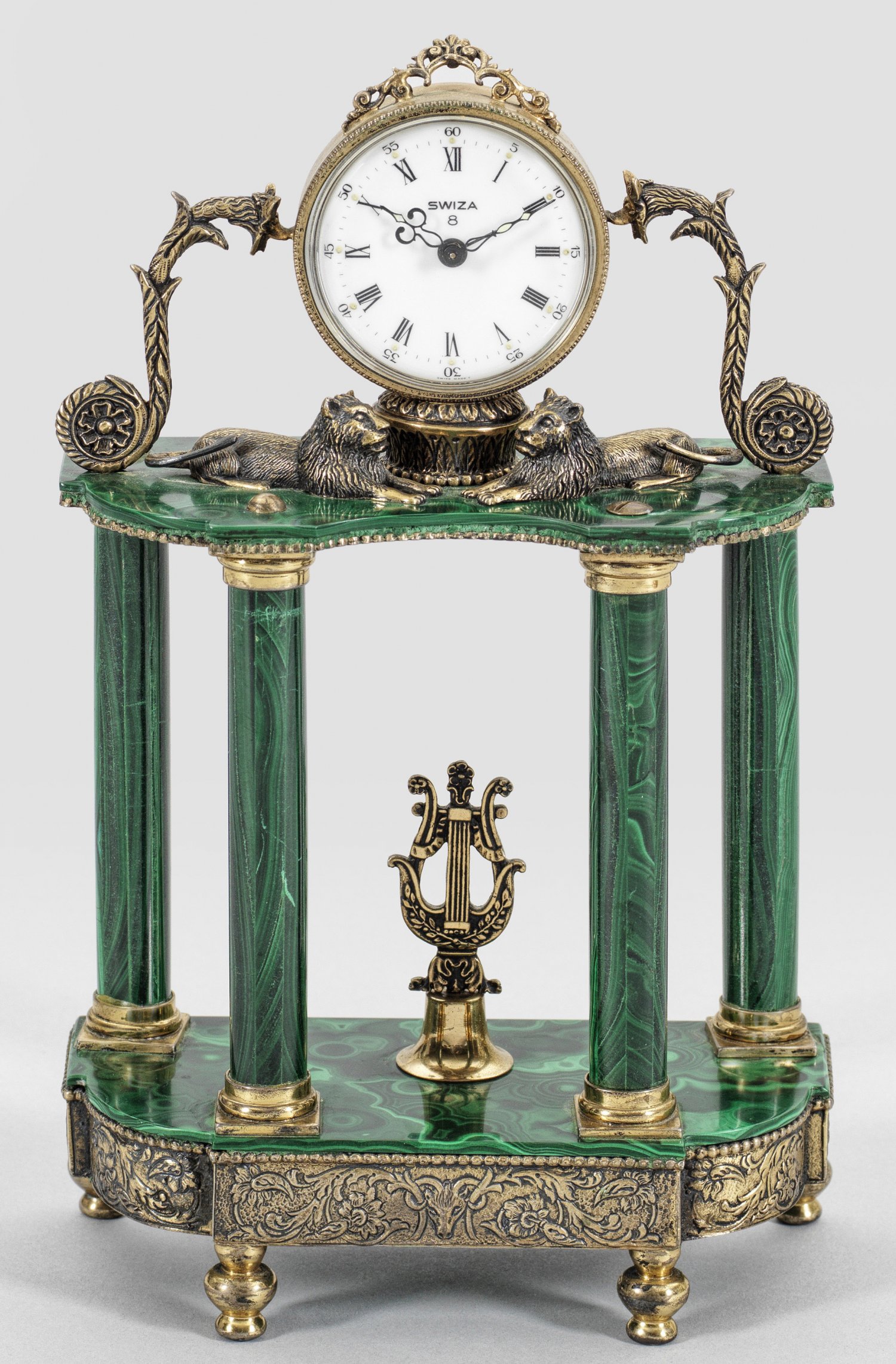 Dekorative Tischuhr Malachit und Silber. Architektonisch gegliederter Korpus aus Vollsäulen. Rundes Uhrengehäuse. Auf blattreliefiertem Sockel mit Balusterfüßen. Als Träger für rundes Uhrengehäuse flankiert von eingerollten Voluten und vollplastischen Löwenfiguren. Zifferblatt bez. SWIZA. Werk mit Handaufzug und Weckfunktion. Überholungsbedürftig. Gest. 800. H. 22 cm. 13,7 cm x 6,5 cm.