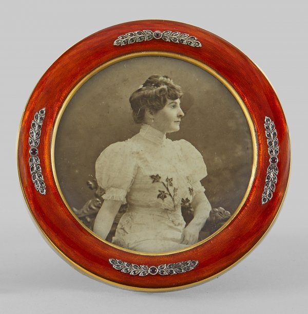 Tischbilderrahmen im Stil von Karl Fabergé. Silber, vergoldet und teilw. emailliert. Runde, hellbraun-orange emaillierte Rahmung mit aufgelegten Blattzweigen, besetzt mit Diamantrosen und Rubincabochons. Aufstellbar. Gest. 88. D. 11,5 cm.