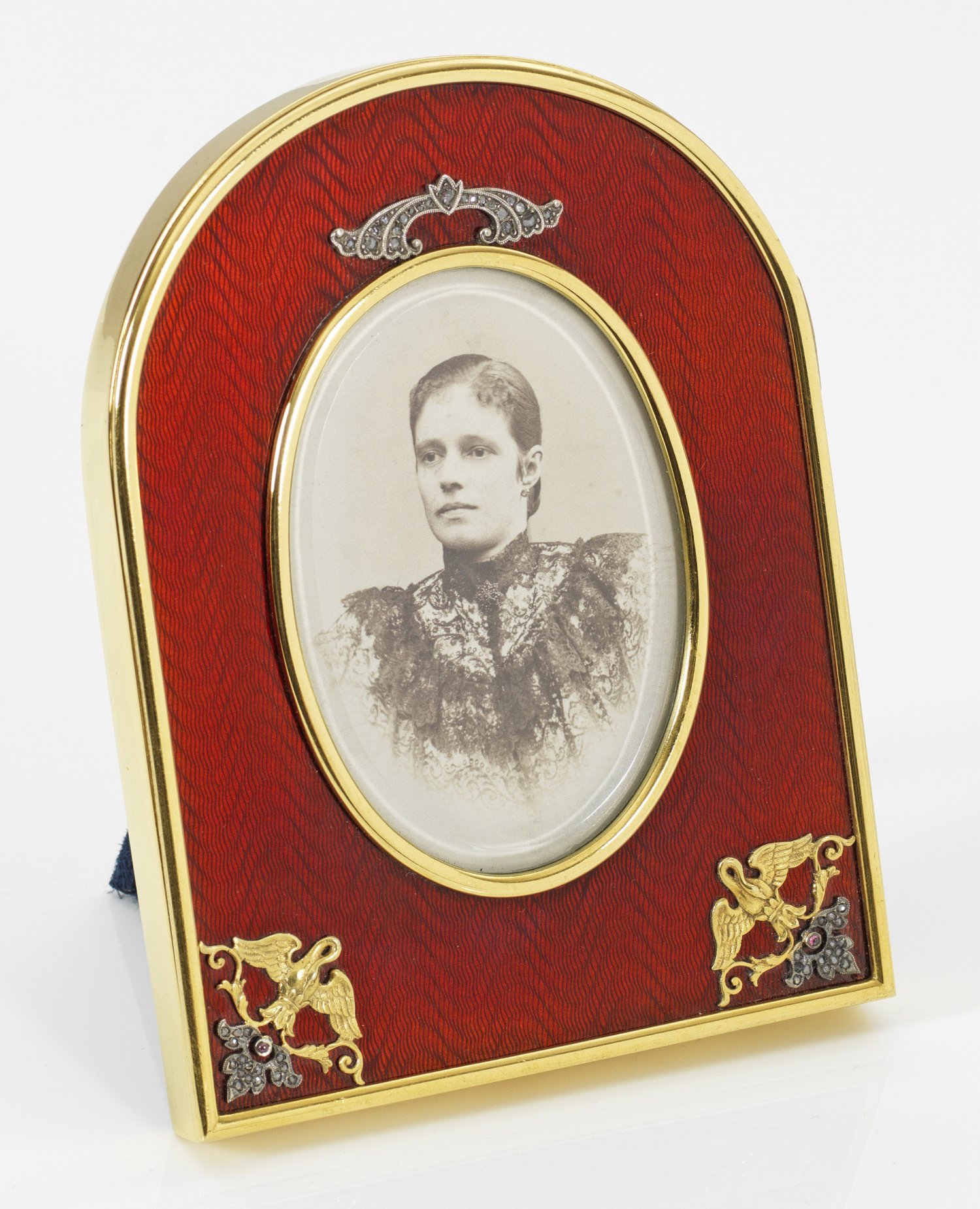 Tischbilderrahmen im Stil von Karl Fabergé. Silber, vergoldet und teilw. emailliert. Geschlossene Hufeisenform. Wellenförmig guillochiert und in Rostrot emaillierte Rahmung mit Applikationen in Form von Schwänen und Voluten, besetzt mit Diamantrosen und Rubincabochons. Aufstellbar. Gest. 88. D. 13,7 cm x 10,5 cm.