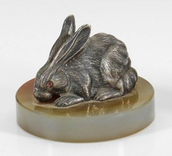 Miniatur-Hase Silber. Auf einem runden, orange-grauen Achat-Sockel ein äußerst naturalistisch gestalteter Hase, besetzt mit zwei Rubinen als Augen. Gest. 84. H. 3 cm.