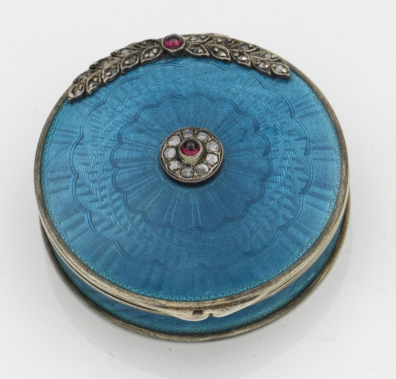 Pillendose im Stil von Karl Fabergé. Silber, teilw. vergoldet und emailliert. Runde Form mit leicht eingezogener Wandung. Der scharnierte, flache Deckel und die Wandung strahlen- und wellenförmig guillochiert und hellblau emailliert. Auf dem Deckel eine applizierte Rosette sowie ein Lorbeerzweig, mit Diamantrosen und Granatcabochon besetzt. Innen vergoldet. Minim. Gebrauchsspuren. Gest. Kokoschnik 88. Gew. ca. 55 g. H. 2 cm. D 5 cm.