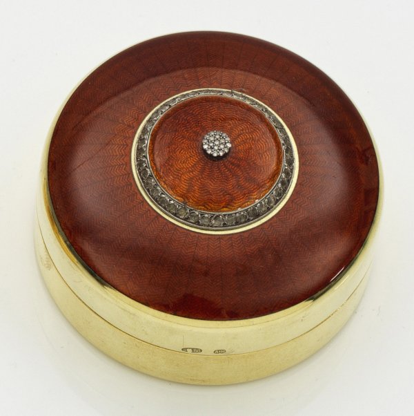 Pillendose im Stil von Karl Fabergé. Silber, vergoldet, teilw. emailliert. Runde Form. Der Deckel rostrot emailliert und wellen- bzw. fischgratförmig guillochiert. Mittig applizierte, runde Diamantrose, gerahmt von einem einreihigen Diamantrosenband. Gest. Kokoschnik 88. Gew. ca. 105 g. D. 6 cm.