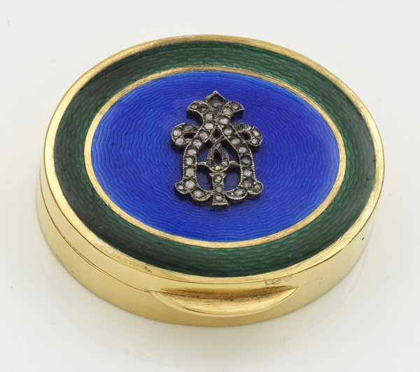 Pillendose im Stil von Karl Fabergé. Silber, vergoldet und emailliert. Ovale Form. Auf flachem, scharniertem Deckel ein aufgelegtes, in sich geschwungenes Ornament mit Diamantrosen besetzt, über grün und blau emailliertem und wellenförmig guillochiertem Grund. Gest. Kokoschnik 88. Gew. ca. 60 g. H. 1,5 cm. 5 cm x 4,5 cm.