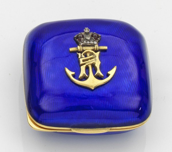 Pillendose im Stil von Karl Fabergé. Silber, voll vergoldet und teilw. emailliert. Quadratische, bombierte Form mit abgerundeten Ecken. Auf dem Deckel applizierter Anker und Initialien mit Krone, besetzt mit Diamantrosen und zwei Granatcabochons über guillochiertem, blau emailliertem Grund. Gest. 88. Gew. ca. 93 g. 5 cm x 5 cm.