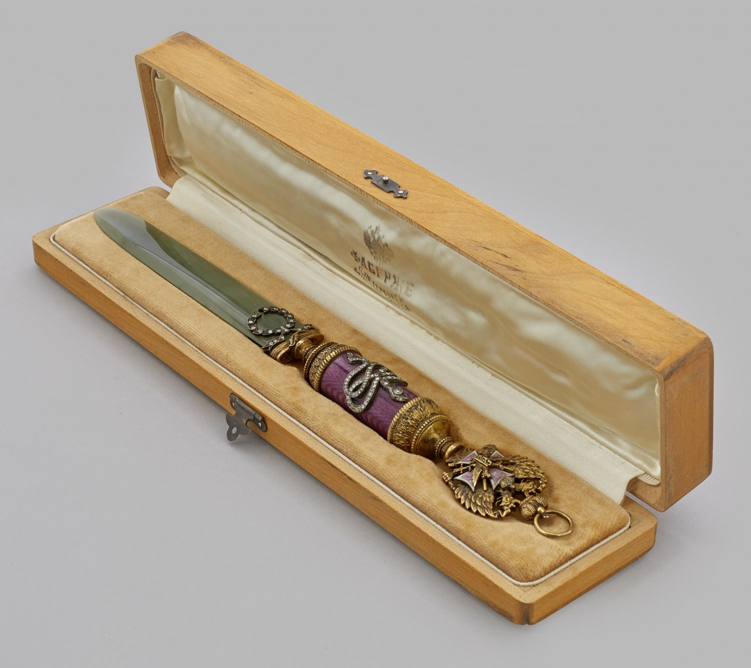 Brieföffner im Stil von Karl Fabergé. Mit Etui aus Holz. Nephrit mit Silbermontierung, teilw. vergoldet. Zylindrischer, fein gouillochierter und lavendelfarben emaillierter Griff, mit Fassungen aus vergoldetem Blattfries. Mittig besetzt mit einer reliefplastischen Silberapplikation mit Diamantrosen in Form einer Schlange. Die Schneide beidseitig mit Diamantrosen besetzt und mit Schmuckapplikationen in Form von Lorbeerkränzen verziert. Als Griffabschluss ein plastisch gearbeiteter, gekrönter Doppeladler. Mit Öse zum Aufhängen. Gest. Kokoschnik 88. L. 25 cm.