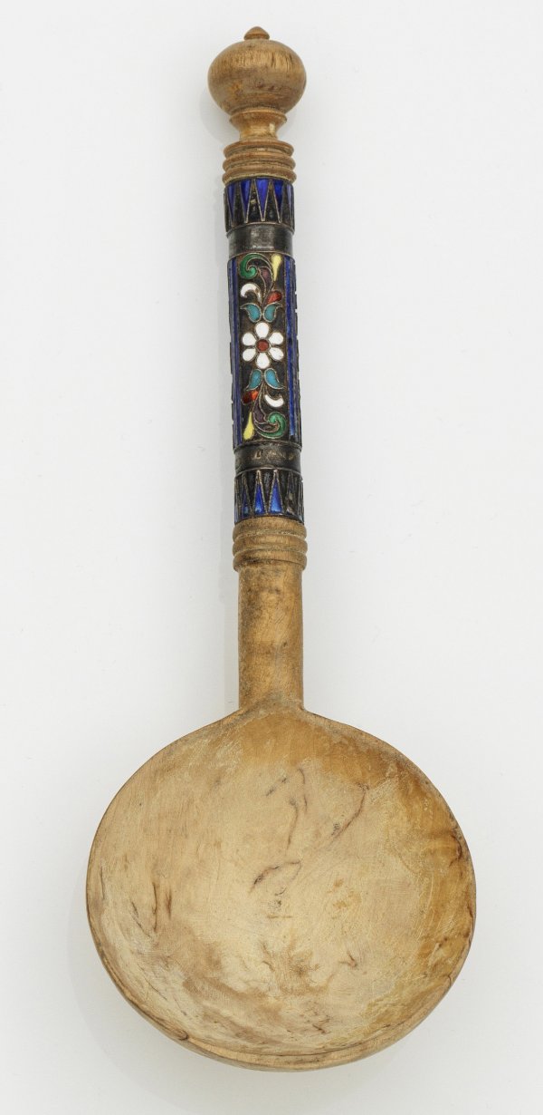 A Russian wooden spoon with enamel and silver mount. Minor signs of use. Standard mark 84.