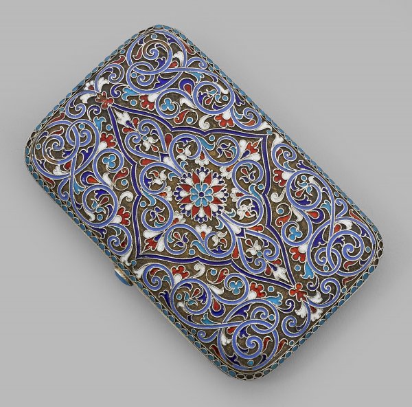 Russisches Cloisonné-Zigarettenetui Silber, vergoldet und emailliert. Rechteckige Form mit gerundeten Ecken und beidseitigem, ornamentalem Dekor aus polychromem Zellenschmelzemail. Drücker mit einem Türkis besetzt. Innen vergoldet und mit Widmung; Gest. 84. Minim. best.; Gew. ca. 168 g. H. 2 cm x 10,5 cm x 6,5 cm.