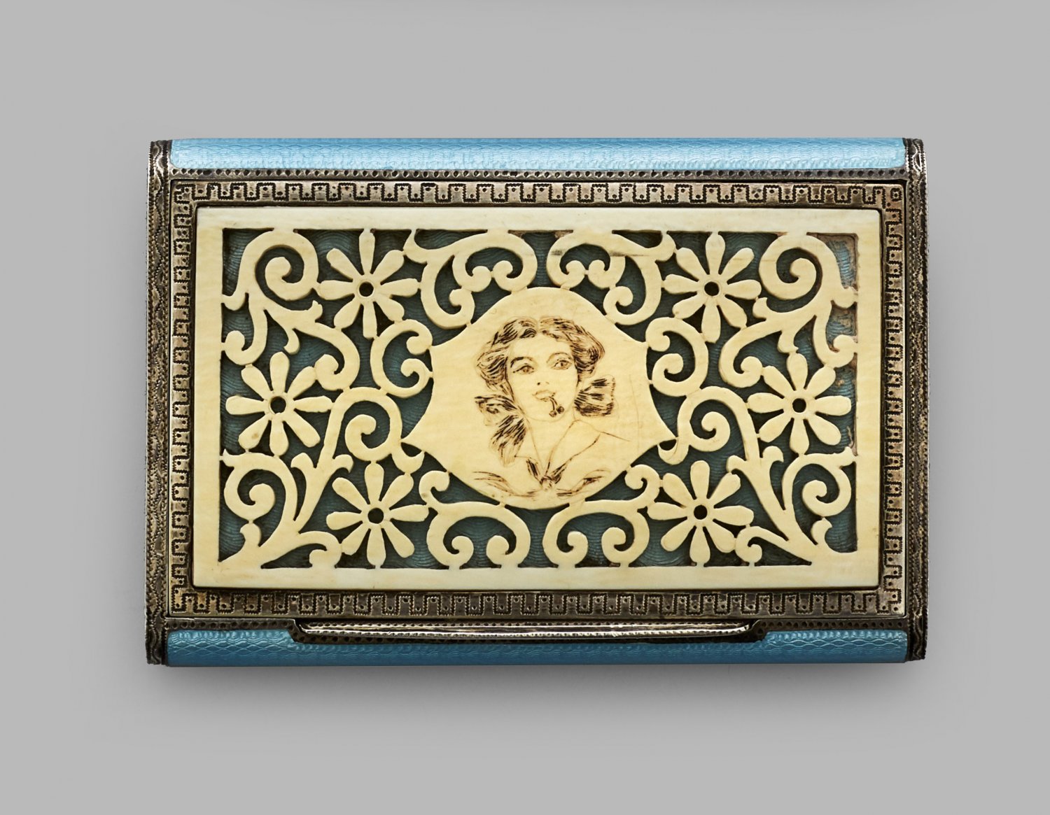 Zigarettenetui Silber und Elfenbein, teilw. emailliert. Rechteckiger Korpus mit gerundeten Längskanten. Flacher Deckel mit schmaler Daumenrast. Flächendeckend wellenförmig guillochiert und eisblau emailliert. Die Ränder mit fein ziselierter Silbermontierung. Auf dem Deckel, über emailliertem Grund und von einem silbernen und ziselierten Mäanderband gefasst, ein durchbrochen gearbeitetes Elfenbeinornament aus stilisierten Blüten und Voluten. Auf einer zentralen Kartusche das gravierte Porträt einer Frau mit Kirschen im Mund. Innen vergoldet. Gest. Beschaumarke, undeutl. Herstellerzeichen. Minim. altersbedingte Gebrauchsspuren. Gew. ca. 190 g. 9 cm x 6 cm.