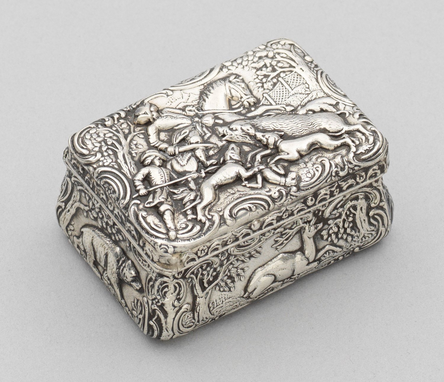 Tabatiere mit Jagdmotiven Silber. Rechteckige Form mit reliefierten Jagd- und Tierszenen. Gest. 13 Lot, Herstellerzeichen. Gew. 105 g. L. 7,5 cm.