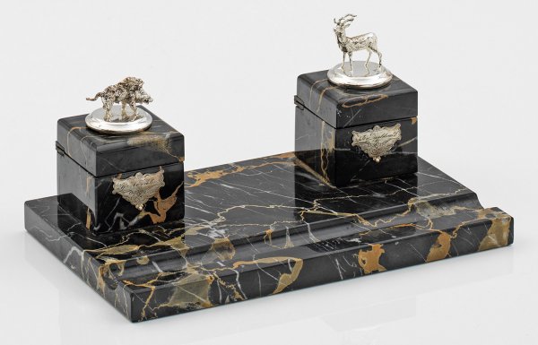Schreibzeug mit Tierfiguren Schwarzer, ockerfarben und weiß geäderter Marmor. Kubische, scharnierte Tintenfässer mit vollplastischen, silbernen Tierfiguren eines Rothirsches und eines Wildschweins, schauseitig zwei silberne Plaketten mit gravierter Widmungsinschrift und Ortsangabe Diepoldsau. H. 12,5 cm. 26 cm x 16 cm.