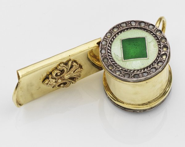 Trillerpfeife Silber, teilvergoldet. Mit Original-Etui. Runder Korpus mit flachem Mundstück und Aufhängöse. Korpus mit Diamantrosen besetzt und hellgrün bzw. grün emailliert. Auf der Unterseite ein appliziertes reliefplastisches Ornament. Gest. 88. Origian-Etui. Gew. ca. 16 g. L. 4 cm.