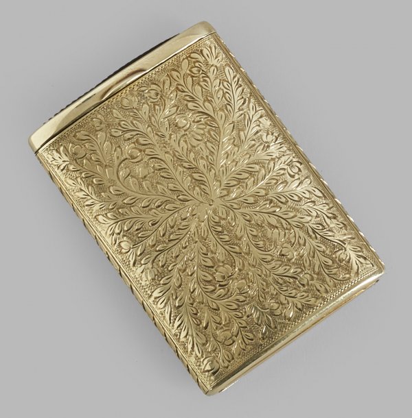 Streichholzetui Gelbgold, gest. 585. Hochrechteckiger Korpus mit ovaler Bodenfläche und gerundeten Seiten. Flacher Deckel mit Drücker zum Aufschieben und eingesetzter Zündfläche. Die Wandung flächendeckend verziert mit äußerst fein ziselierten Blattranken. Gest. 585. Minim. altersbedingte Gebrauchsspuren. Gew. ca. 38 g. 6 cm x 4 cm.