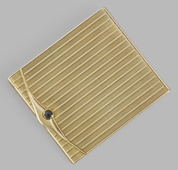 Streichholzetui Gelbgold, gest. 585. Hochrechteckiger Korpus mit scharniertem, flachem Deckel. Ein Saphircabochon als Drücker. Allseitig linearer, reliefierter Guillochedekor. Gest. 585. Minim. altersbedingte Gebrauchsspuren. Gew. ca. 49 g. 6 cm x 5,2 cm.