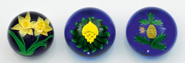 Drei Paperweights mit Blume und exotischen Früchten aus limitierten Editionen. Farbloses Glas. Kugelig. Über dunkelblauem Grund die naturalistischen Darstellungen einer Bananentraube, einer blühenden Ananaspflanze sowie einer Narzisse mit zwei Blüten. Herstellersignatur und -marke, dat., teilw. bez.; Ein Paperweight best.; H. 5,6 cm - 5,8 cm.