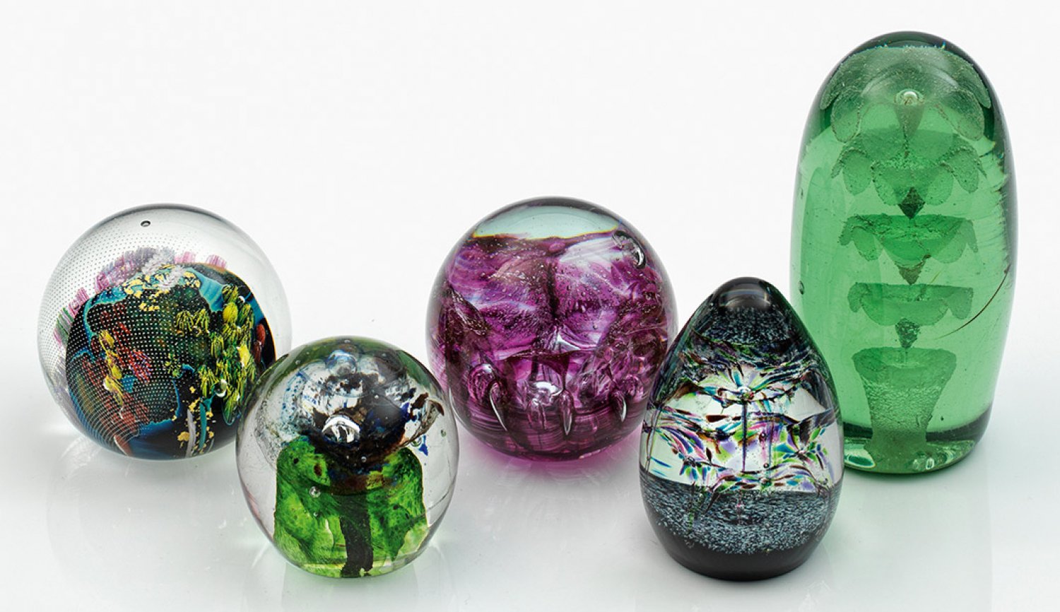 Fünf abstrakt gestaltete Paperweights Farbloses bzw. grünes Glas. Kugelig, ei- und kegelförmig. Polychrome Ziereinschmelzungen in Krösel-Technik, mit Goldpulver sowie eingestochenen Luftblasen. Teilw. aus limitierten Editionen, mit Herstellermarke und Signatur und bez.; Altersgemäße Gebrauchsspuren. Teilw. besch.; H. 7,3 cm - 15,5 cm.