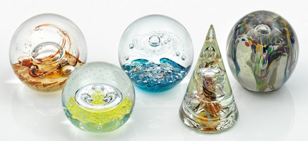 Fünf abstrakte Paperweights Farbloses Glas. Kugelig bzw. kegelförmig. Eingestochene Luftblasen sowie polychrome Ziereinschlüsse u. a. in Kröseltechnik. Teilw. aus limitierter Edition, bez. oder dat. sowie mit Herstellerzeichen. Ein Paperweight minim. best.; H. 6,5 cm - 11,7 cm.