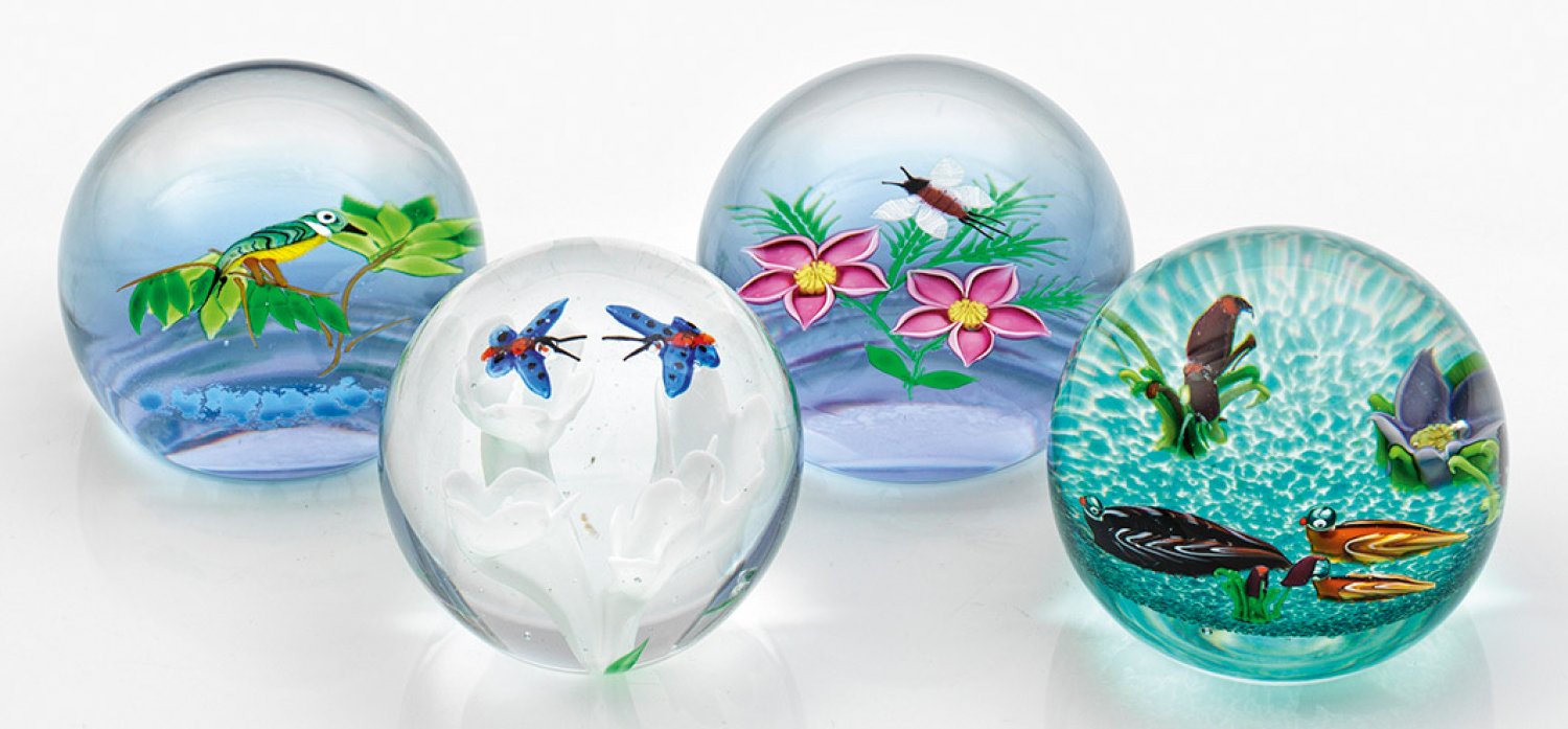Vier Paperweights Farbloses Glas. Kugelig. Polychrome Ziereinschmelzungen in Form von naturalistisch gestalteten Enten auf einem Teich, farbenfrohen Schmetterlingen über Blüten schwebend sowie einem Eisvogel auf einem Zweig sitzend. Teilw. aus limitierten Editionen, mit Herstellersignatur und bez.; H. 6 cm - 6,5 cm.