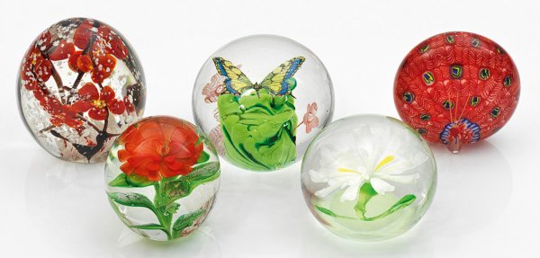 Fünf florale Paperweights Farbloses Glas. Teilw. kugel- und eiförmig sowie als stilisierter Pfau mit geschlagenem Rad. Polychrome Ziereinschmelzungen u. a. in Form von Blüten oder einem Schmetterling. Minim. altersbedingte Gebrauchsspuren. H. 6 cm - 9 cm.