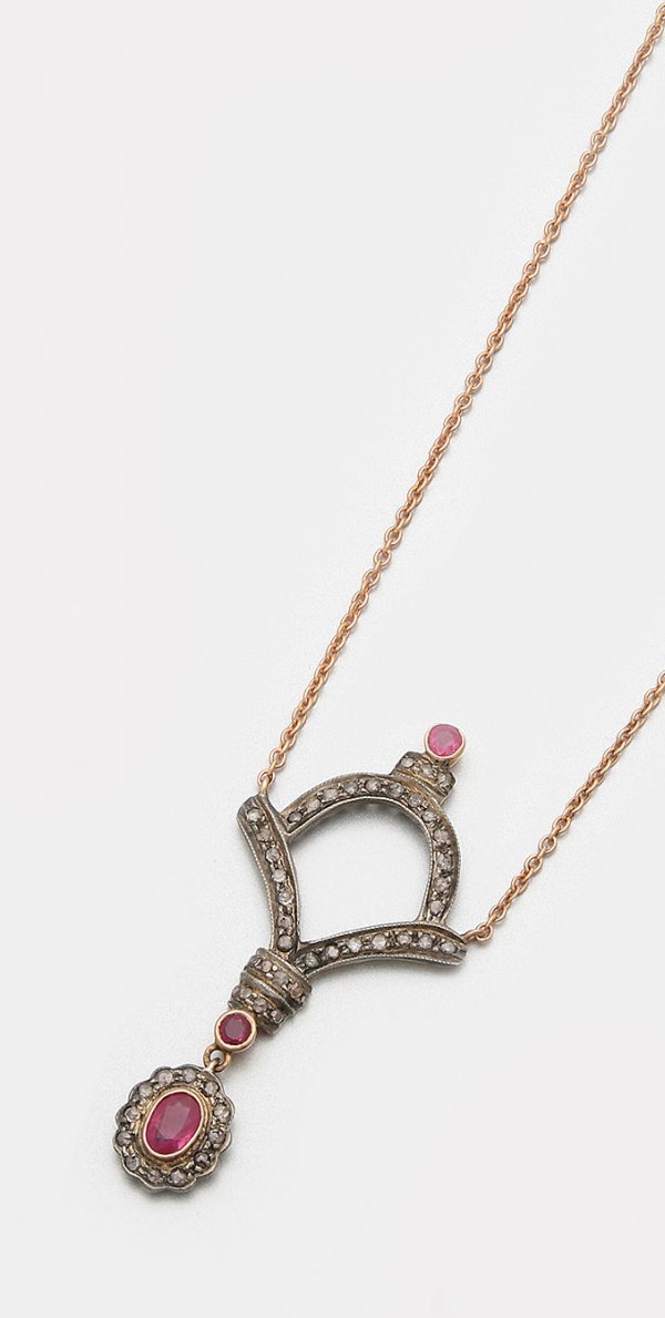 Jugendstil-Rubincollier Roségold, gest. 585. Anhänger schauseitig besetzt mit taubenblutroten Rubinen von zus. ca. 0,85 ct. und Diamantrosen von zus. ca. 0,60 ct.; Ges.-Gew. ca. 5,25 g.
