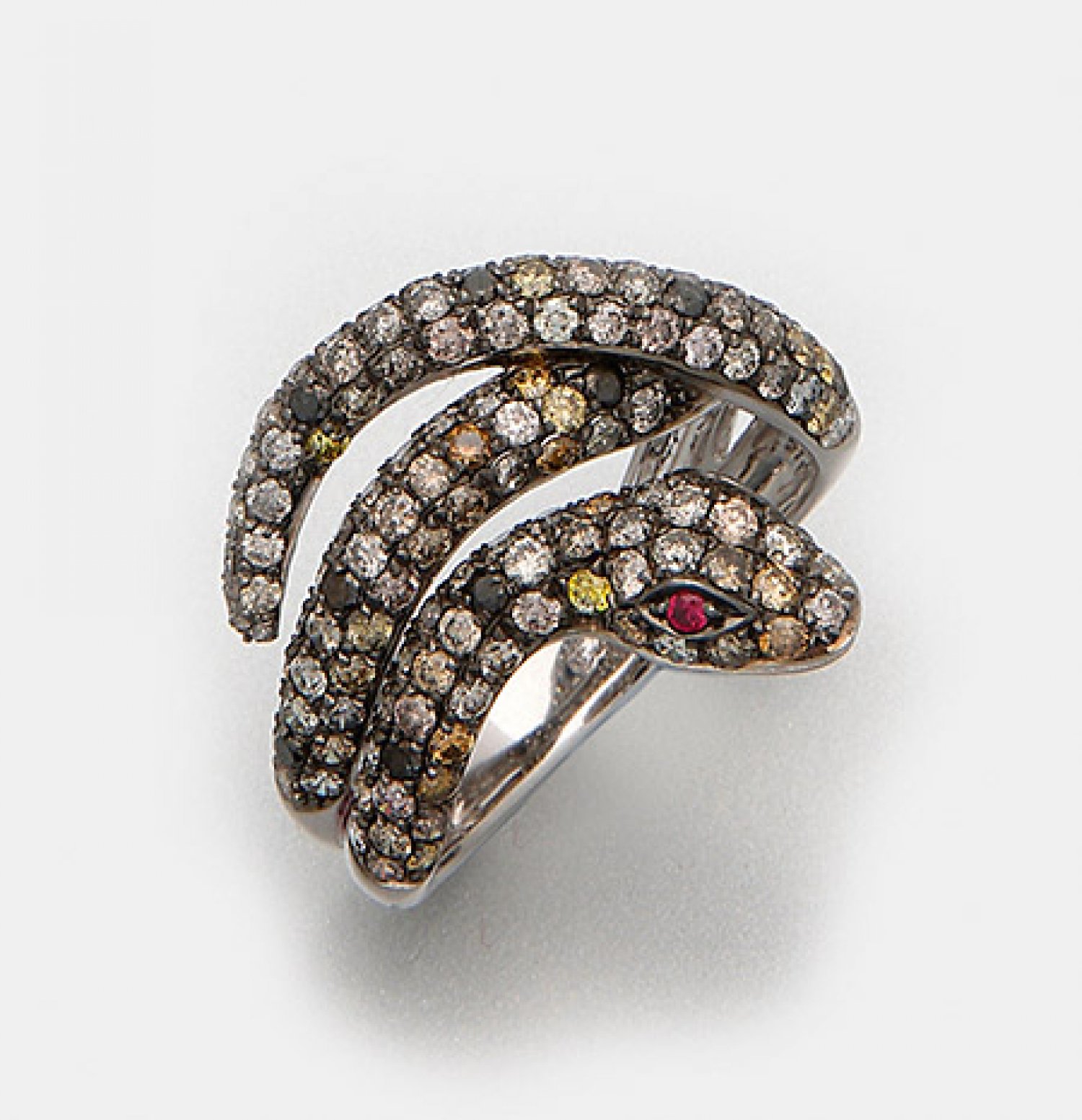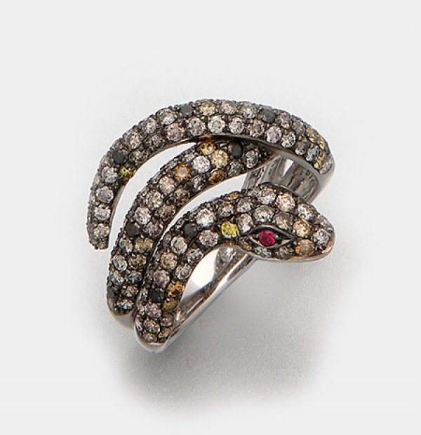 Diamant-Schlangenring Weißgold, gest. 750. Ausgefasst mit schwarzen, braunen und gelben Diamanten von zus. ca. 2,32 ct.; Gew. ca. 6,23 g.