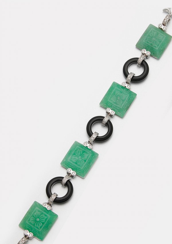 Jade-Armband im Art Déco-Stil Weißgold, gest. 750. Bandform aus quadratischen und kreisförmigen Gliedern, schauseitig besetzt mit schwarzem Onyx und mintgrüner Jade, akzentuiert durch kleine Diamanten von zus. ca. 0,48 ct.; Gew. ca. 31,24 g.