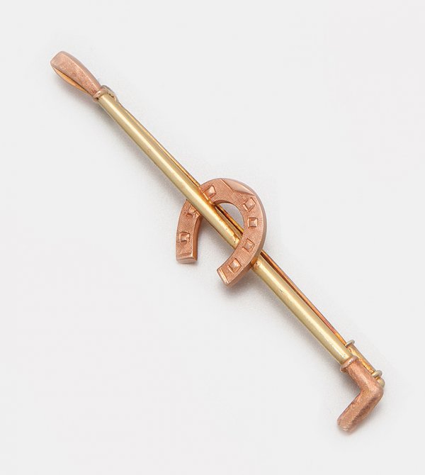 Plastron-Nadel Gelb- und Roségold, gest. 585. In Form einer Reitgerte mit Hufeisen. Gew. ca. 6,94 g.