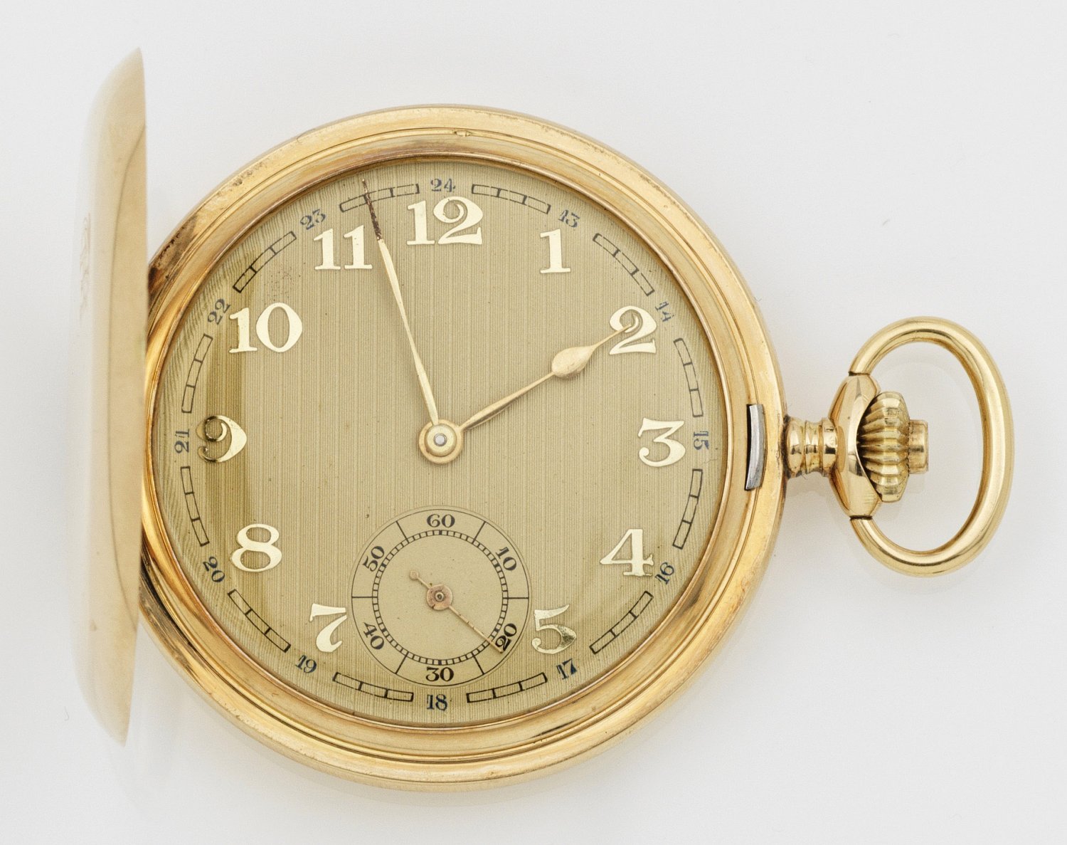Savonette-Taschenuhr Deutsch. Um 1920. Gelbgold, gest. 585. 2-Deckelgehäuse, fein geriffeltes Zifferblatt mit aufgelegten arabischen Zahlen, Dauphinzeigern und kleiner Sekunde. Mechanisches Werk mit Handaufzug. Monogrammiert. D. 5,1 cm. Gew. ca. 79,49 g.