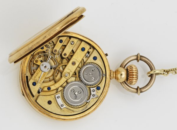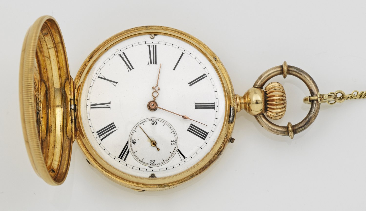 Savonette-Taschenuhr England. Um 1900. Gelbgold, 18 ct.; Fein guillochiertes 3-Deckelgehäuse, weißes Emailzifferblatt, schwarze römische Zahlen, Gold-Dauphinzeiger und kleine Sekunde. Mechanisches Werk mit Handaufzug. Dazu Uhrenkette aus 333er Gold. D. 4,5 cm. Ges.-Gew. ca. 80,40 g.