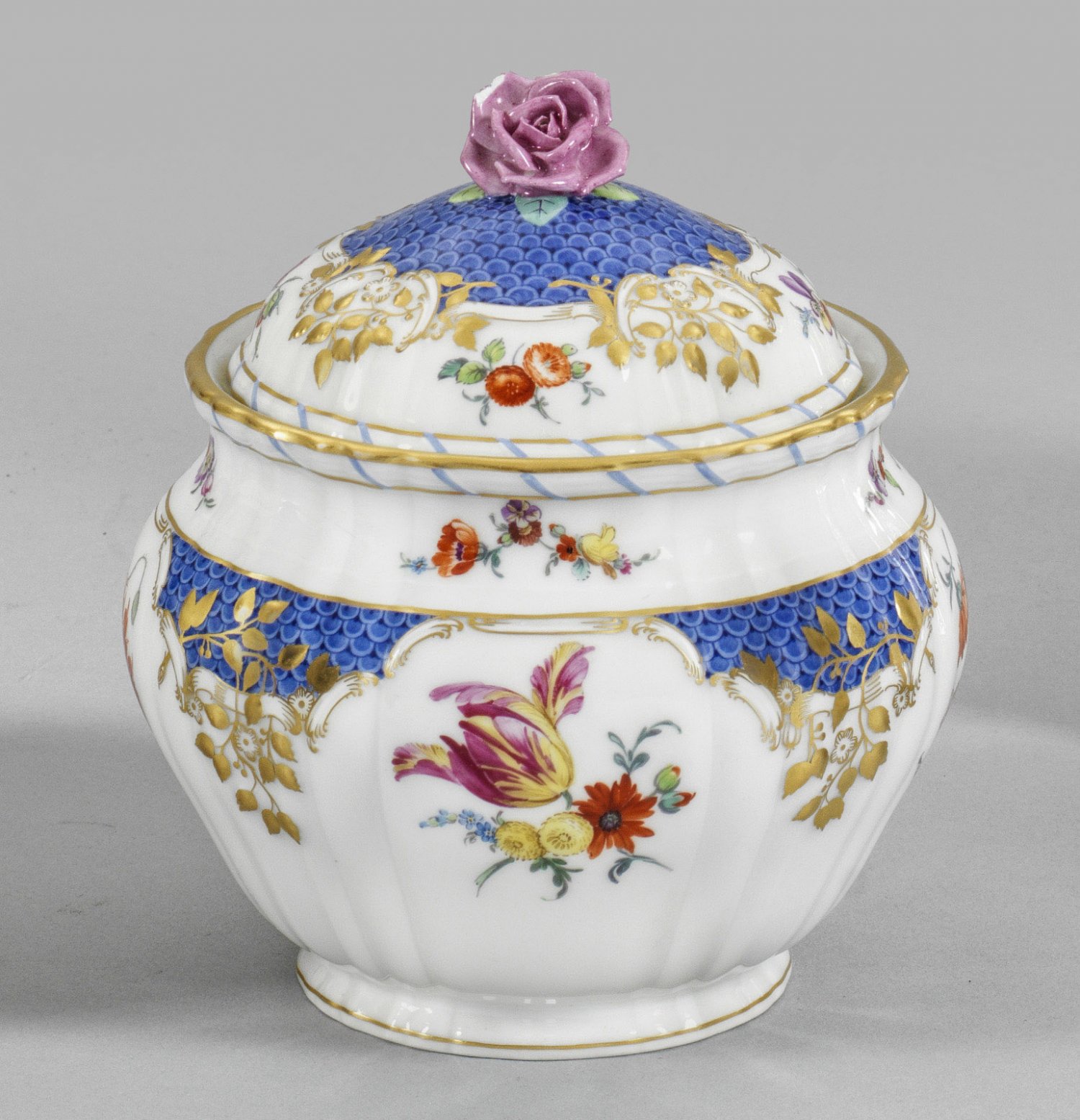 Große Zuckerdose "Breslauer Stadtschloss" Reliefdekor "Rocaille". Umlaufend farbenfrohe Blumenbuketts und feine, von Rankenwerk umzogene, blaue Schuppenmosaikfonds. Polychrome Malerei mit reicher Goldstaffage. Unw. best.; Zepter- und Malereimarke. H. 14,5 cm.