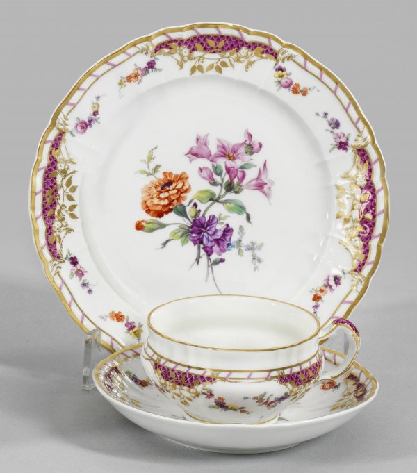 Teegedeck Gedrückte, bauchige Tassenform. Feiner reliefplastischer Dekor "Rocaille". Am Rand purpurfarbenes Schuppenmuster und umlaufende, von einer Blütengirlande umwundene Goldbordüre. Im Spiegel Blumenbukett. Polychrome Malerei mit Goldstaffage. Jahresbuchstabe, Zepter- und Malereimarke. D. 19,5 cm.