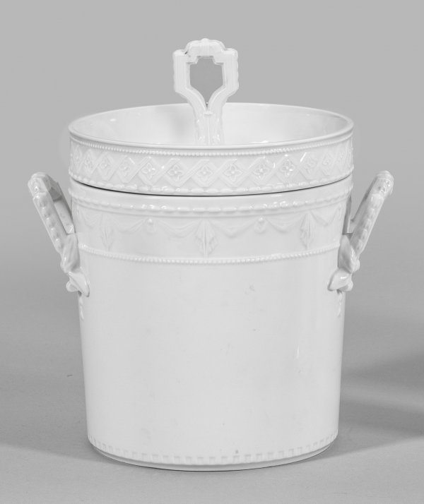 Eiskühler "Kurland" bzw. "Kurländer Muster". 2-tlg.; Weißporzellan. Klassizistische Form. Umlaufender Reliefdekor aus Tuchgehänge und Blütenbordüre. Zeptermarke. H. 27 cm.