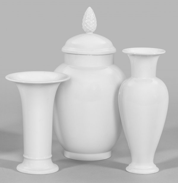 Drei Ziervasen Weißporzellan. Baluster- und Trichterform, u. a. sog. "Apothekerbüchse". Entw. u. a. Friedrich Elias Meyer und Karl Friedrich Schinkel. Zeptermarke. H. 19 cm - 32 cm.