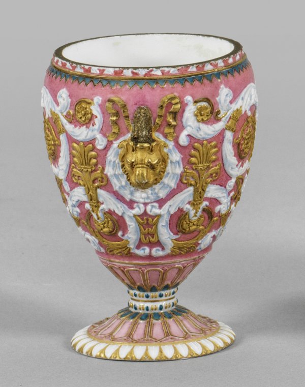 Kleine Ziervase mit Arabeske-Dekor Biskuitporzellan, teilw. glasiert. Ovoider Korpus auf eingezogenem Rundfuß. Auf der Wandung reicher Reliefdekor aus geflügelten, eine Lyra haltenden Hermesfiguren, plastischem Löwenkopf und Laub- und Bandelwerk auf "rose pompadour"-Fond. Umlaufend verschiedene Ornamentbordüren. Polychrome Malerei mit Goldstaffage. Monogr.; Undeutl. dat.; Chromgrüne Manufakturmarke. H. 9,5 cm.