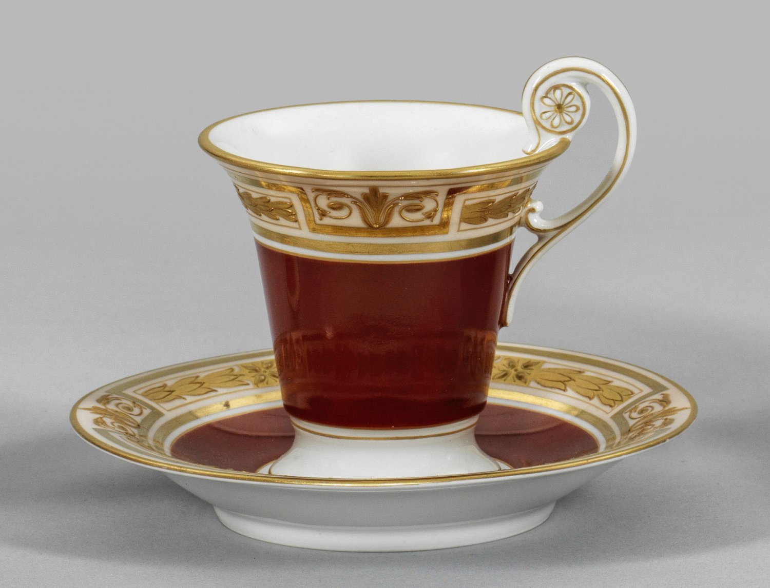 Prächtige Ziertasse mit Reliefgolddekor auf Untertasse. Kalathosform mit geschweiftem Rosettenhenkel. Auf der Wandung und im Spiegel rostbraune Farbbordüre mit feinem, reservengerahmtem Reliefgolddekor aus stilisiertem Rankenwerk, Lorbeerfestons und Blüten auf chamoisfarbenem Fond. Malerzeichen für Emil Richard Claus. Zepter- und Malereimarke. Tassen-H. 9,5 cm.
