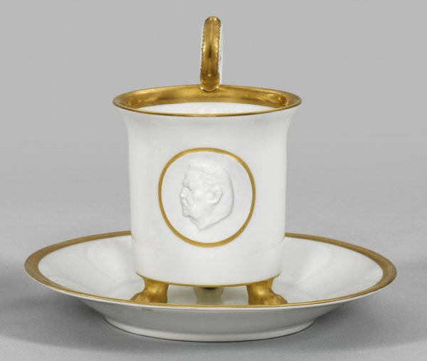 Porträttasse "Paul von Hindenburg" auf Untertasse. Walzenförmiger Korpus auf vier Tatzenfüßen. Rückseitig hochgezogener Volutenhenkel. Auf der Schauseite goldgerahmtes Biskuitmedaillon mit Reliefbildnis des Reichspräsidenten Paul von Hindenburg. Weißporzellan mit Matt- und Poliergoldstaffage. Relief-Entw. Edwin Scharff. Zepter- und Malereimarke. Tassen-H. 14 cm.