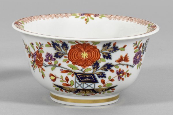 Zierkumme mit Tischchenmuster Beidseitig der Wandung sog. Tischchenmuster mit farbenprächtigen Chrysanthemen- und Päonienzweigen. Unterglasurblaue Malerei, polychrom überdekoriert. Innenrand mit umlaufender Ornamentbordüre und asiatischen Blüten. Schwertermarke. H. 8 cm.