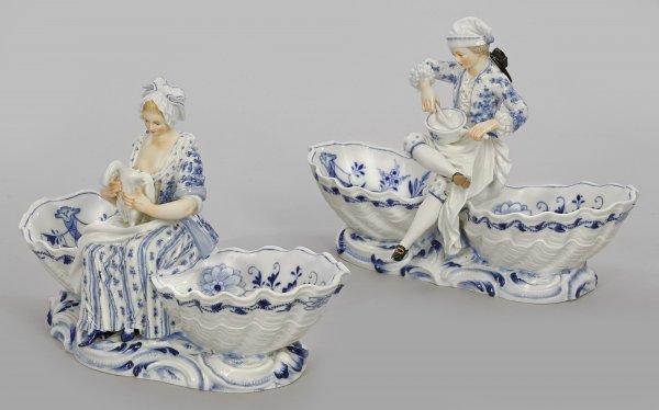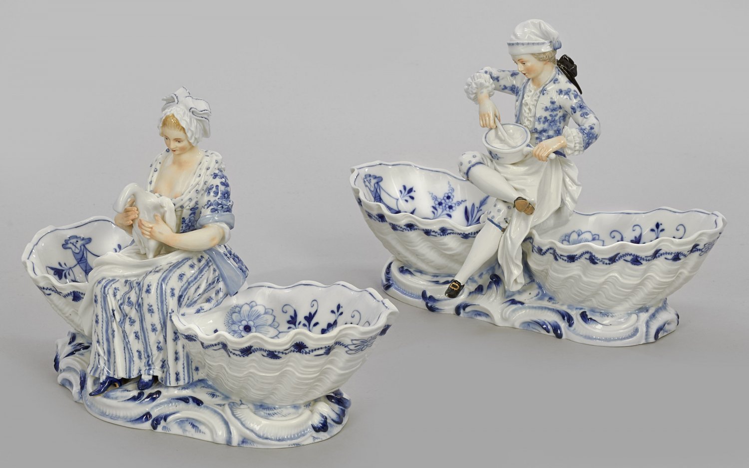 Paar große figurale Gewürzschalen als Tafeldekoration Gegenstücke. Über rocaillereliefiertem Sockel, zwischen zwei tief gemuldeten Muschelschalen, sitzende Köchin bzw. Koch in gemusterter Kleidung, eine Gans rupfend und eine Speise rührend. Auf der Innenwandung feiner Zwiebelmusterdekor. Unterglasurblaue und polychrome Malerei. Teilw. minim. rest.; Schwertermarke. H. 16 cm - 17 cm. 25 cm x 11 cm.