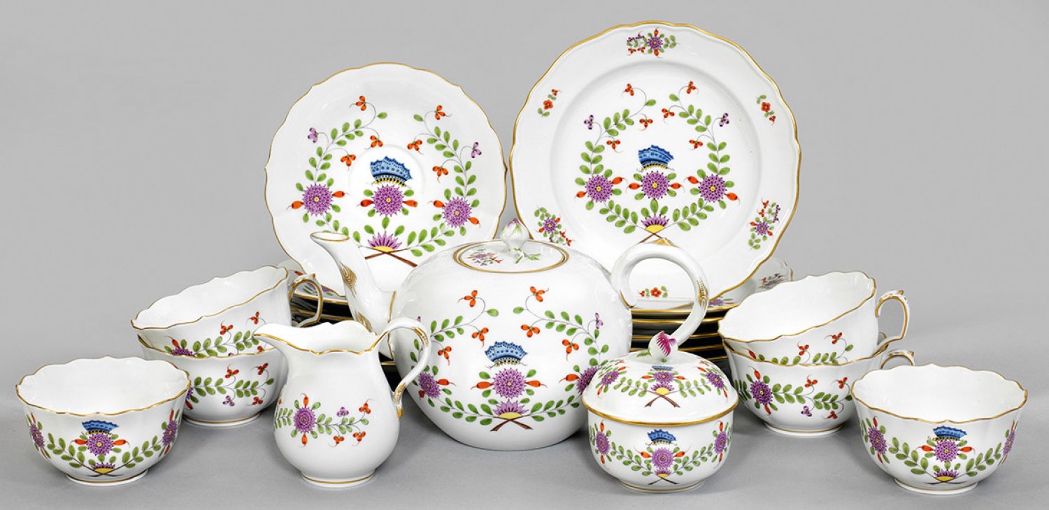 Teeservice mit Indianischem Blumendekor für 6 Personen. 15-tlg.; Teekanne, Zuckerdose, Sahnegießer, 6 Tassen mit Untertassen, 6 Kuchenteller. Dekor "Alte chinesische Blumenmalerei mit Schmetterling" nach ostasiatischem Vorbild in polychromer Malerei. Minim. rest./best.; Schwertermarke. Kannen-H. 13 cm. Teller-D. 18 cm.