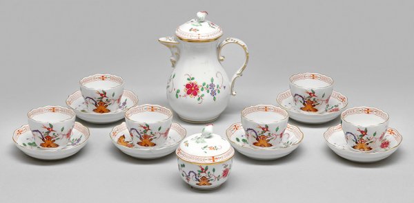 Mokkaservice mit "Fels-und Vogel"-Dekor 8-tlg.; Mokkakanne, Zuckerdose, 6 Tassen mit Untertassen. Polychrome Fels- und Vogelmalerei in der Art der Marcolini-Periode. Umlaufende Ornamentbordüre. Goldstaffage. Teilw. stark rep.; Schwertermarke. Kannen-H. 16,5 cm.