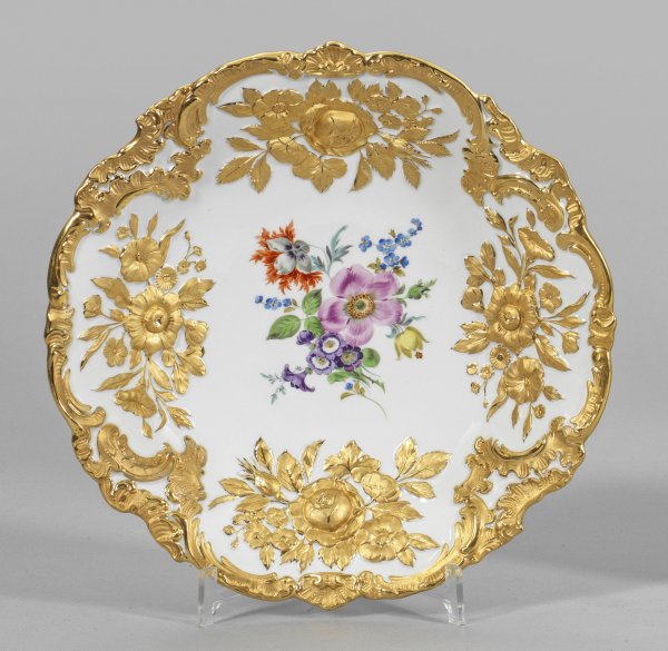Prunkschale mit Blumendekor Runde, gemuldete Form. Im Spiegel farbenfrohes Blumenbukett. Auf der ansteigenden Fahne stark reliefplastische, von Rocaillen gerahmte Blumenarrangements. Polychrome Malerei mit sog. Goldbronze. Schwertermarke. D. 30 cm.