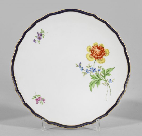 Tortenplatte mit Blumendekor Flache, gemuldete Form. Im Spiegel feine Blumenmalerei. Umlaufender, kobaltblauer, goldkonturierter Rand. Schwertermarke. D. 32,5 cm.