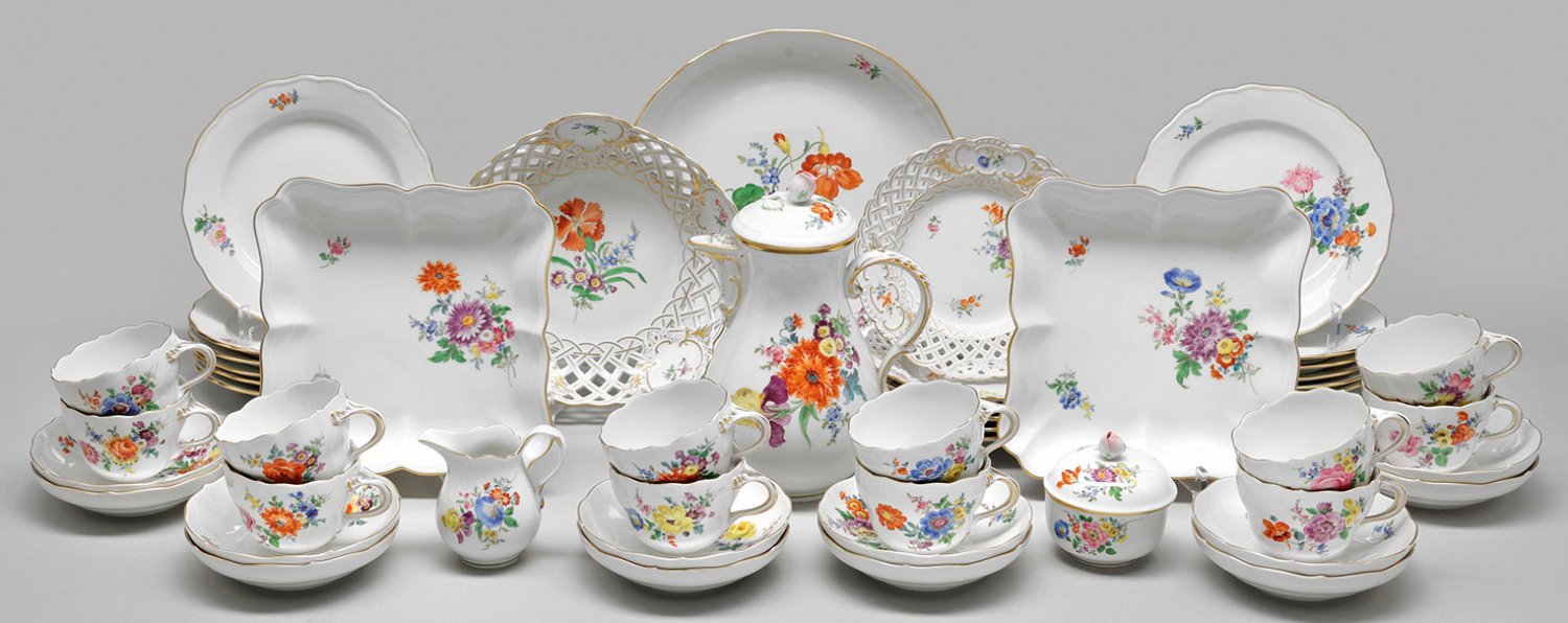 Kaffeeservice mit Dekor "Deutsche Blume" für zwölf Personen. 37-tlg.; Kaffeekanne, Sahnegießer, Zuckerdose, 12 Tassen mit Untertassen, 18 Kuchenteller, 3 Gebäckschalen, -platte. Teilw. durchbrochen gearbeitet. Auf der Wandung und im Spiegel farbenprächtiger Blumendekor in polychromer Malerei. Goldstaffage. Schwertermarke. Kannen-H. 24 cm. Platten-D. 28 cm.